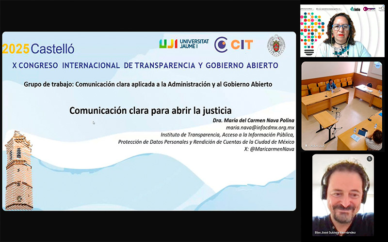 La Comisionada Nava Polina presentó estos avances durante su participación virtual en el X Congreso Internacional de Transparencia y Gobierno Abierto, celebrado en Castellón, España, como parte del Grupo de Trabajo: Comunicación clara aplicada a la Administración y al Gobierno Abierto.