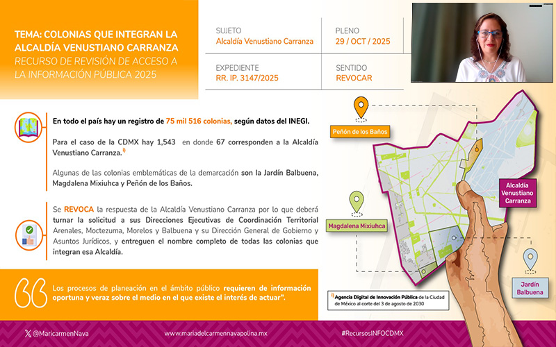 A propuesta de la Comisionada Ciudadana María del Carmen Nava Polina, el Pleno del Instituto de Transparencia, Acceso a la Información Pública, Protección de Datos Personales y Rendición de Cuentas de la Ciudad de México (INFO CDMX), resolvió que la Alcaldía Venustiano Carranza deberá proporcionar información precisa sobre el nombre y fundamento legal de todas sus colonias, en un plazo de 10 días hábiles.