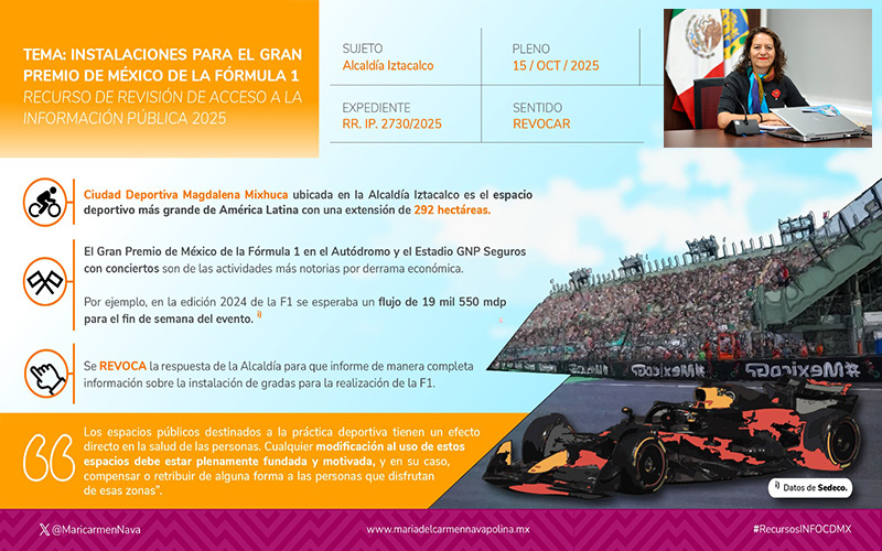 El recurso de revisión está relacionado con una solicitud dirigida a la Alcaldía Iztacalco, en la que una persona pidió conocer las condiciones de instalación de gradas entre las puertas 12 y 13 de la Ciudad Deportiva Magdalena Mixhuca, así como otras ubicadas en la puerta 8, dentro de la zona del Autódromo Hermanos Rodríguez, donde se realiza el Gran Premio de México de Fórmula 1.