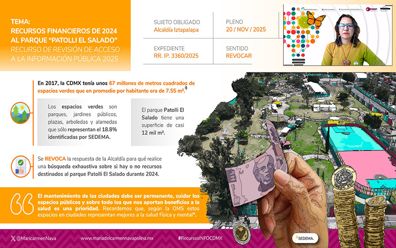 La Comisionada María del Carmen Nava Polina presentó la resolución del expediente INFOCDMX/RR.IP.3360/2025, en la que se propone revocar la respuesta de la Alcaldía Iztapalapa y ordenar una nueva búsqueda sobre los recursos ejercidos en 2024 para el parque “Patolli El Salado”.