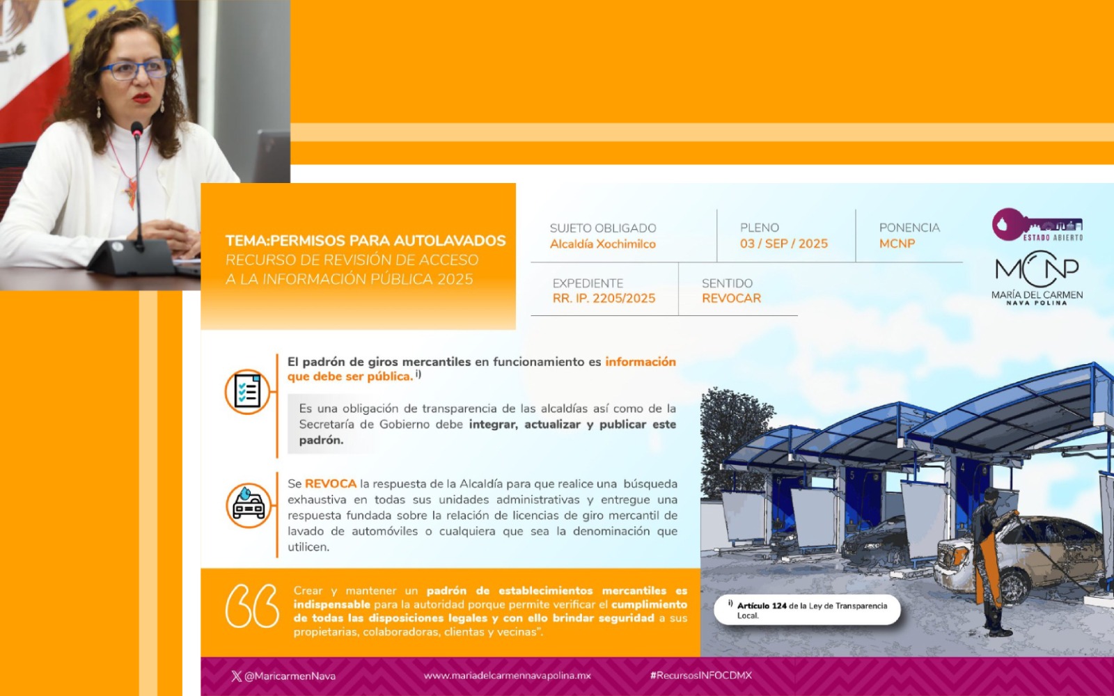 La Comisionada Ciudadana del Instituto de Transparencia, Acceso a la Información Pública, Protección de Datos Personales y Rendición de Cuentas de la Ciudad de México (INFO CDMX), María del Carmen Nava Polina, propuso revocar la respuesta de la Alcaldía Xochimilco a una solicitud de acceso a la información relacionada con establecimientos de lavado de automóviles.